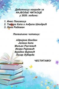 Најбољи читалац 2020. године Posted by Snežana Marković on 25. фебруара 2022. 25. фебруара 2022. Vesti У Библиотеци „Митар Пешикан“, традиционално су додељене награде за најбоље читаоце године. Честитамо награђенима! Share on FacebookShare on Twitter